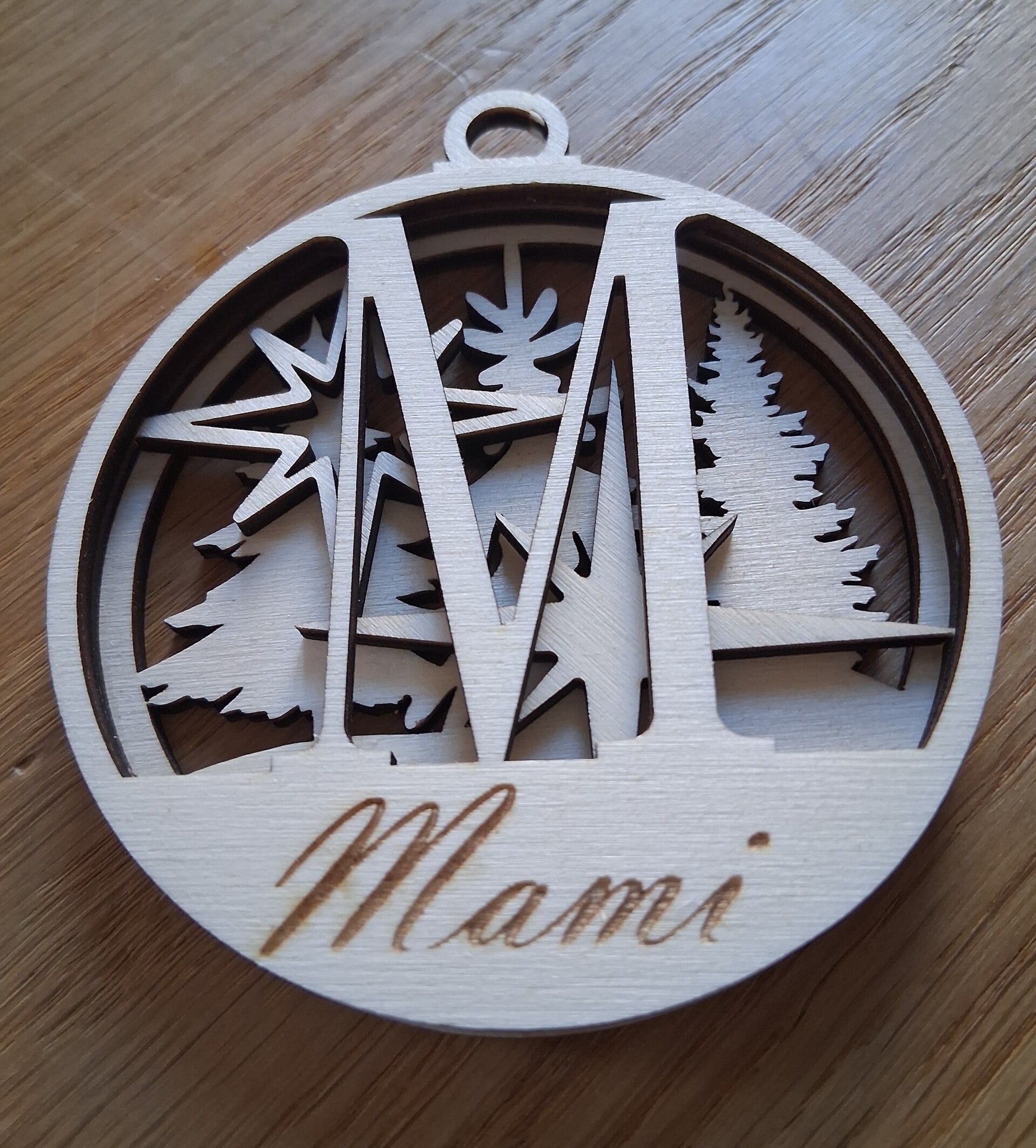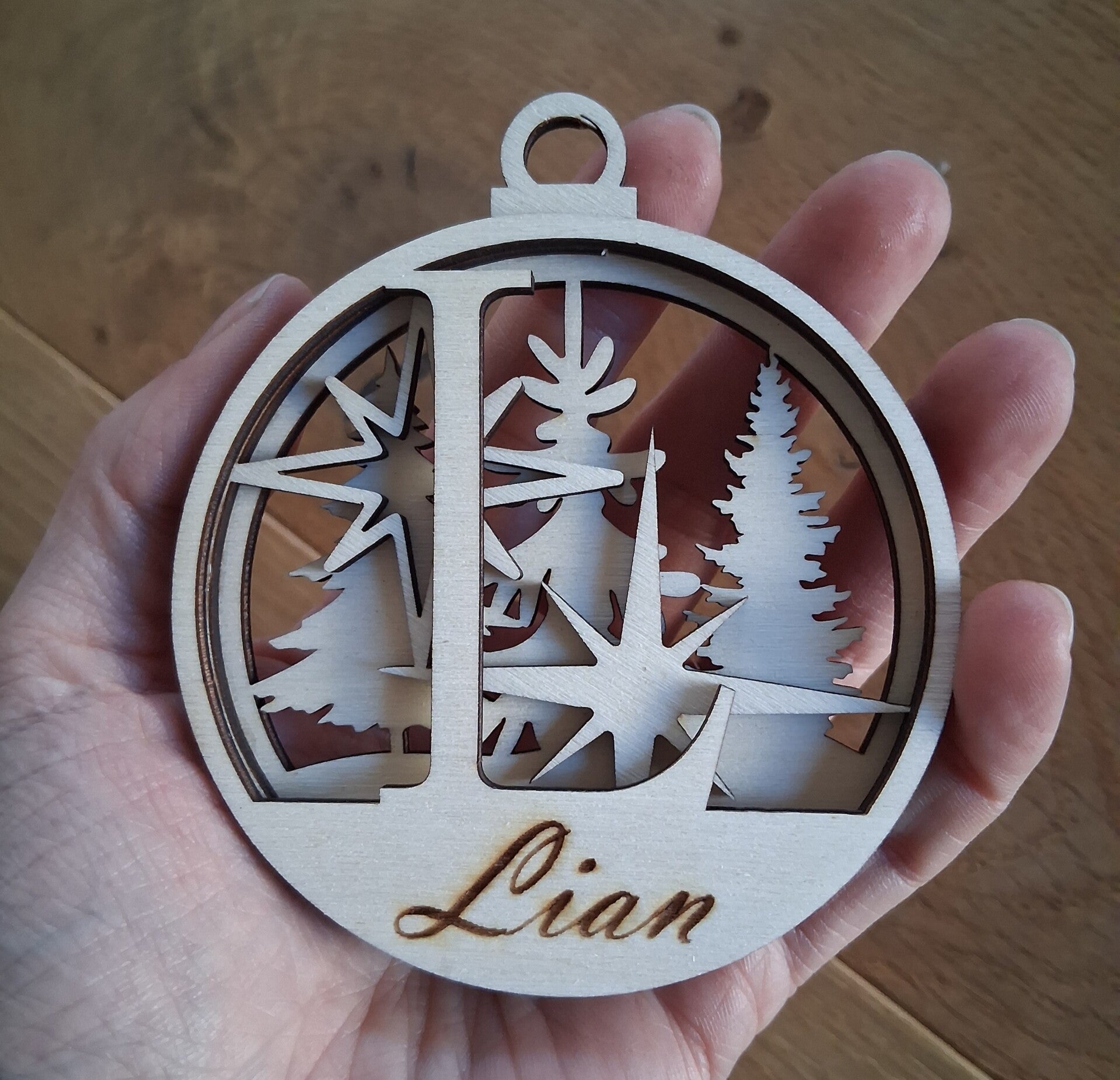 Personalisierte Holzkugel-Anhänger mit Anfangsbuchstaben & Name. In 6, 8 oder 10 cm, aus 3 Lagen Holz gelasert – perfekt als Geschenk & Deko. Fotos breite 8cm