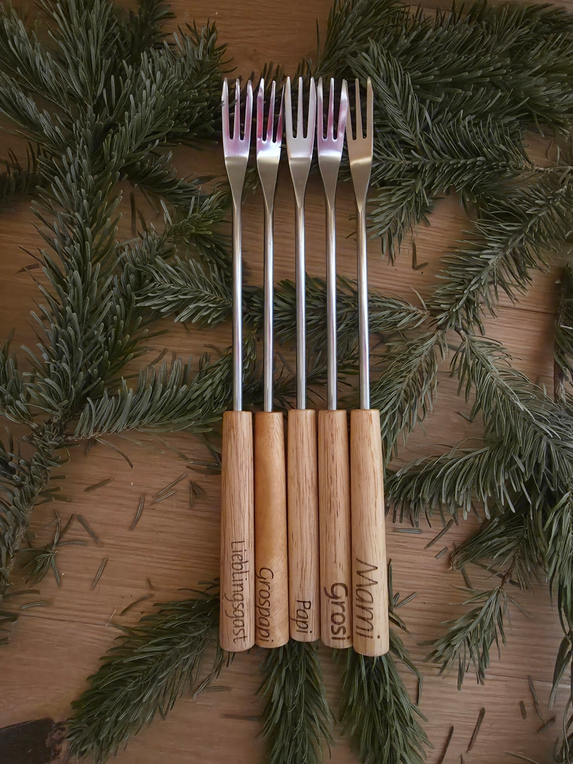 Hochwertige Fonduegabeln mit Holzgriff – individuell graviert mit Name, Lieblingsgast oder Wunschtext. Perfekt als Geschenk für Fondue-Abende/ Liebhaber oder Weihnachten.