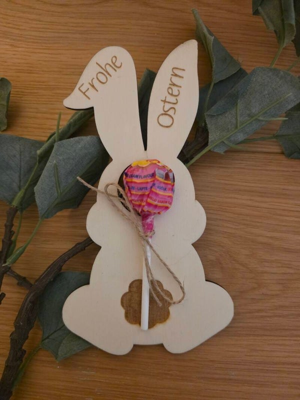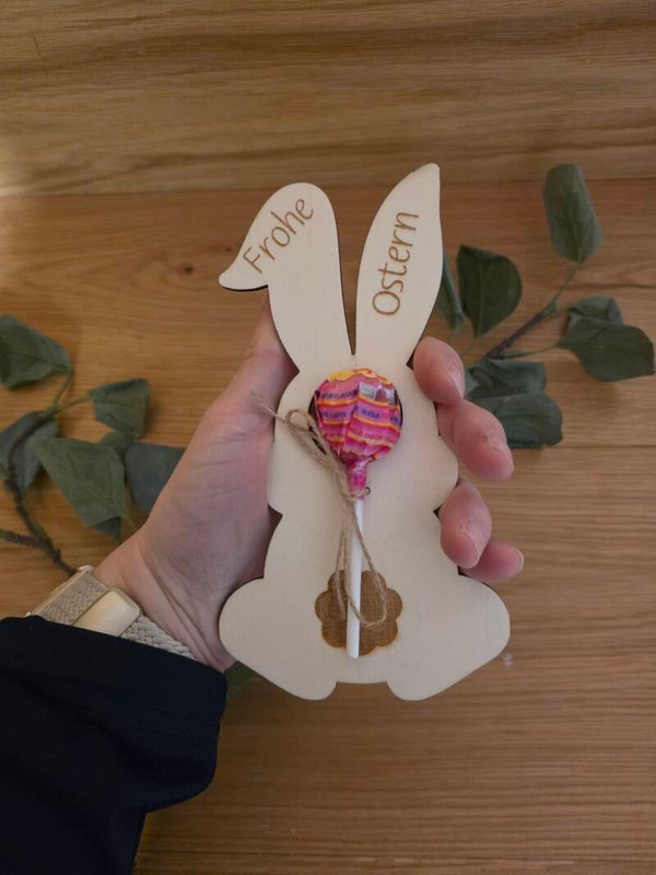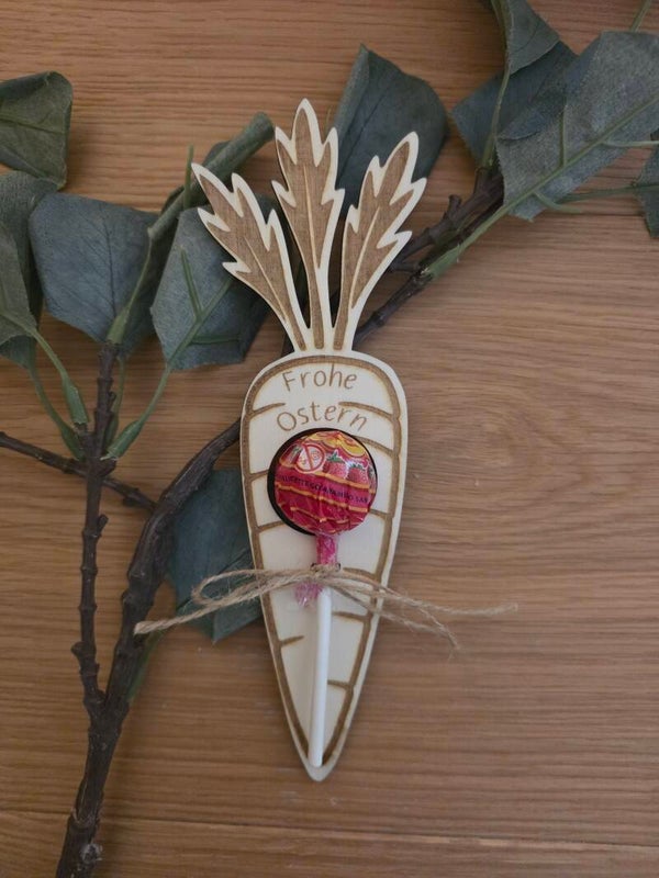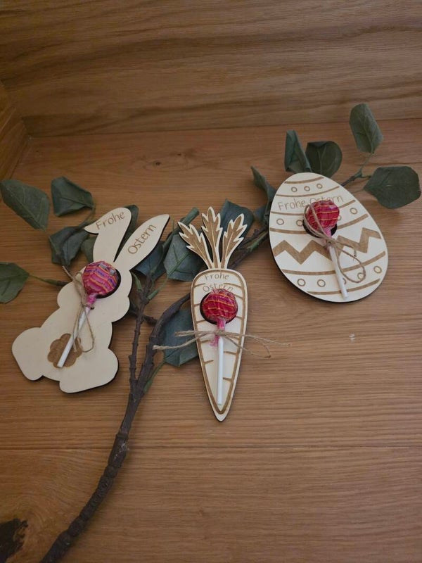 Süßer Oster Lolli als Geschenkidee: Holz Anhänger mit „Frohe Ostern“ in Form von Hase, Karotte und Osterei mit Lollipop. Perfekt als kleines Ostergeschenk, Mitgebsel oder Tischdeko.