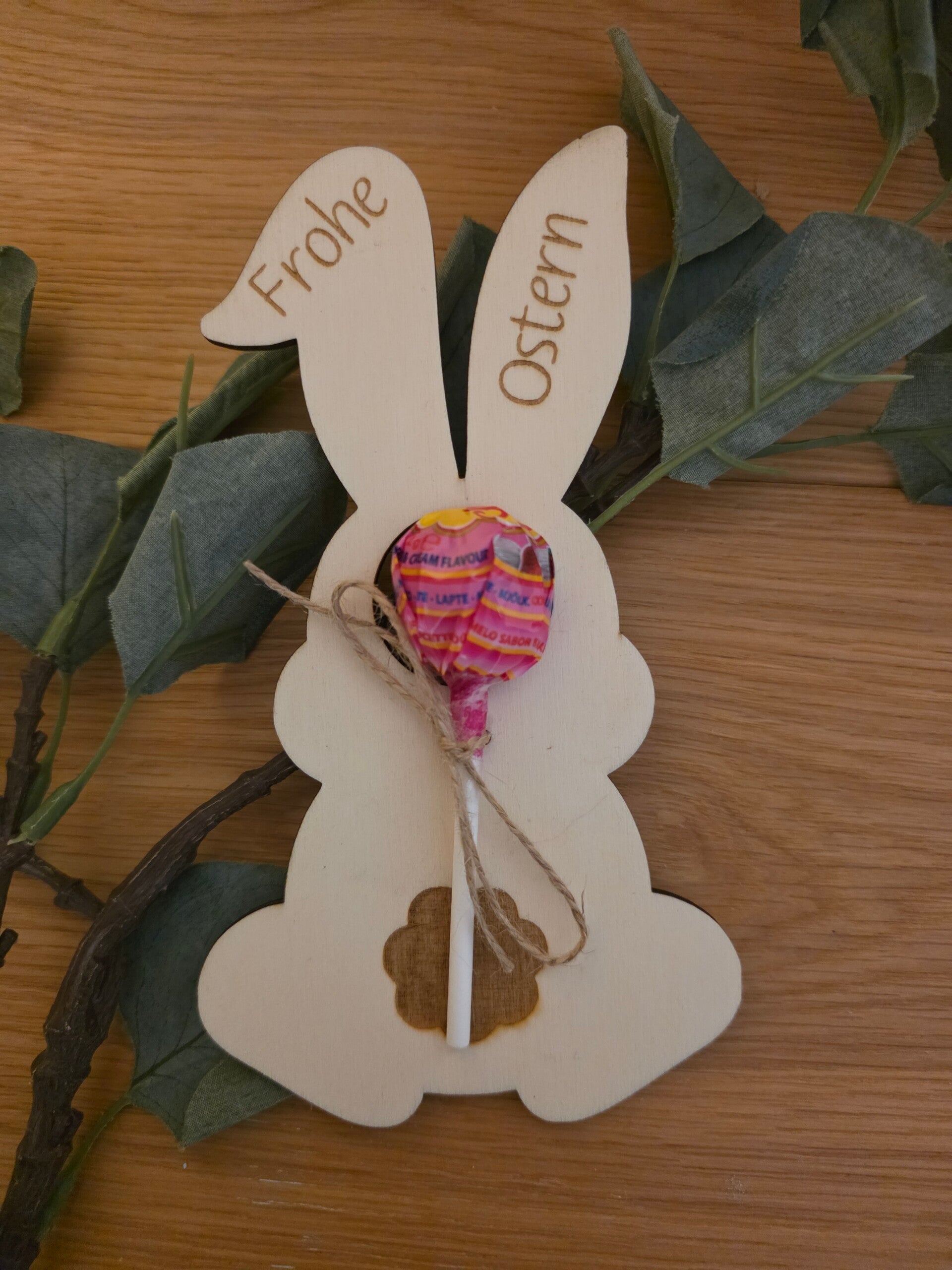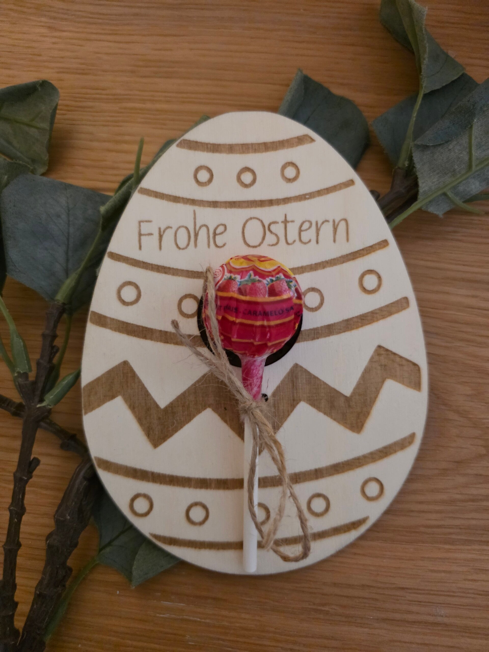 Der Lolli wird mit einer dekorativen Schnur am Holzanhänger befestigt und kann nach dem Naschen auch als Osterdekoration oder Anhänger weiterverwendet werden.